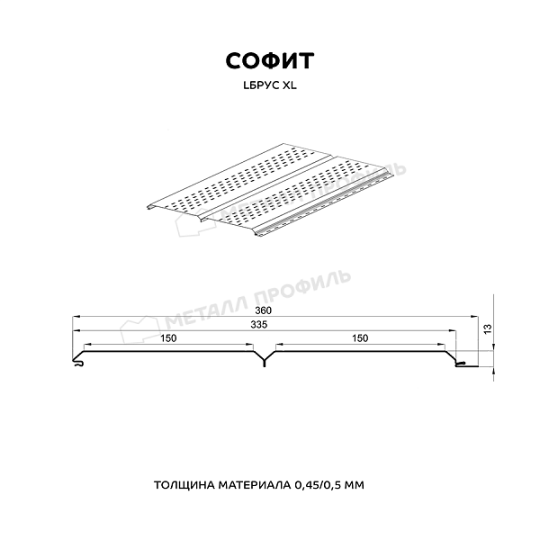 Софит — это специальные панели из серии Lбрус, оснащённые перфорацией на лицевой стороне. Они предназначены для подшивки карнизных свесов кровли. Благодаря аккуратному внешнему виду софит придаёт зданию завершённость и эстетическую целостность. Перфорированные отверстия обеспечивают вентиляцию подкровельного пространства, предотвращая скопление конденсата, а также развитие плесени и грибка.